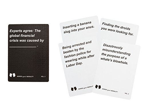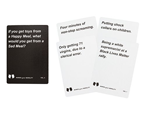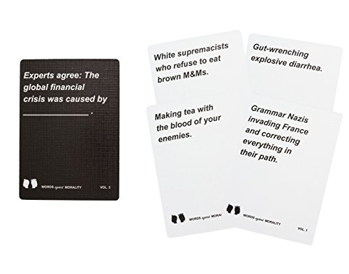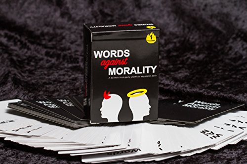 Words Against Morality is sure add color and vulgarity to your next game night. Gameplay is as easy as A-B-C. One player poses a question using a black card, and the remaining players respond with their most amusing white card. See full rules below: Object: Create the most unique, hilarious, and downright devilish combinations of black and white cards. Setup: Each player is dealt ten white cards. Gameplay: One player (the judge) flips over a black card. The remaining players place their most hilarious white card facedown in a pile. The judge reads the combinations aloud, and awards the black card to the player with their favorite match. Rotate the judge each round. Winning: After all cards have been played, the player with the most black cards is the winner. Cards Against Humanity is a trademark of Cards Against Humanity LLC and is completely unaffiliated with this game or its publisher.Feature
