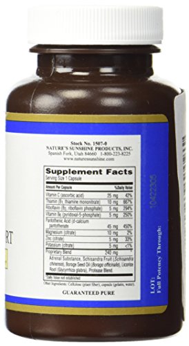 How It Works: Certain hormones in the body-called stress hormones-prepare the body to deal with stressful situations by increasing the heart rate and the force of contraction and blood flow to the heart, liver, and to skeletal and adipose tissue. These stress hormones are produced and regulated by the adrenal glands. They also dilate airways to the lungs and increase blood levels of glucose and fatty acids. The adrenal hormones and their functions are linked to virtually all of the body systems. Thus, many physiological processes and bodily functions, including cardiovascular health, sex drive, pH balance, skin conditions, energy levels, mood and overall psychological outlook often correlate to adrenal gland function. Adrenal Support is a synergistic blend of vitamins, minerals, enzymes and adaptogenic herbs specially formulated to nourish and strengthen the adrenal glands and to promote glandular secretion. Ingredients: 25 mg vitamin C (42% Daily Value), 10 mg thiamin (667% DV), 5 mg riboflavin (294% DV), 5 mg vitamin B6 (250% DV), 45 mg pantothenic acid (450% DV), 10 mg magnesium (3% DV), 5 mg zinc (33% DV), 5 mg potassium, bovine adrenal substance, schizandra fruit, borage seed oil, licorice root and protease blend. Recommended Use: Take 1 capsule with a meal twice daily.Feature