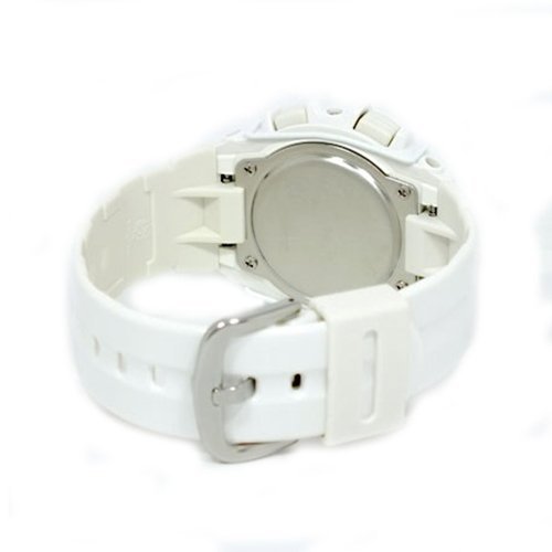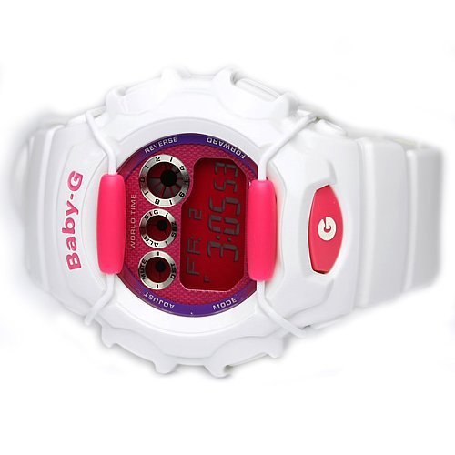 White resin case with a white rubber strap. Fixed white bezel. Digital metal pink dial with hours, minutes, seconds, am/pm date and day of the week hour markers. Dial Type: Digital. Luminescent el backlight. Digital quartz movement. Scratch resistant mineral crystal. Solid case back. Case dimensions: 44.7 mm x 39.8 mm. Case thickness: 14.6 mm. Tang clasp. Water resistant at 100 meters / 330 feet. Additional Info: world time 29 time zones (48 cities), city code display, 4 daily alarms and 1 snooze alarm, 1/100 second stopwatch, elapsed time, split time, 1st-2nd place. Casual watch style. Casio Baby G Tough White Metallic Pink Dial Ladies Watch BG1006SA-7A.Feature