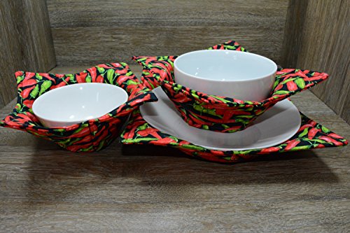 Product Description Microwave cozy set includes 1 small bowl cozy (Approx 6.5" sq), 1 medium bowl cozy (Approx 8" sq), 1 dinner plate cozy (Approx 10" sq.) The dinner plate cozy can also be used for round casserole dishes and the small size is great for coffee mugs! These microwave cozies are the perfect solution to handling super-hot dishes. Cooking and reheating food in a dish cozy makes life so much easier! Place your microwaveable dish inside the bowl cozy and put the whole thing in the microwave to heat. To take the bowl out, you simply grab the corners of the cozy. We found that our kids can now get their dishes out of the microwave safely. Cozies will also protect your fingers from the cold when holding a bowl of ice cream and are great for protecting your table. You can also use a cozy placed on top the dish you are microwaving to help steam food. MATERIALS: * 100% cotton fabric * 2 layers of 100% cotton batting * 100% cotton thread Please be advised: Bowl cozies must only be used in microwaves with a rotating base. To avoid scorching or burning, please make sure cozy freely rotates in your microwave. Never leave microwave unattended. Make sure cozy is clean with no pieces of food attached. Do not microwave cozy for more than three minutes. Cozies can be machine washed on delicate cycle. Reshape and allow to air dry for best results. Please let us know if this is a gift, and we will ship without a packing slip enclosed! #bowlcozy #microwaveable #handmadeatamazon #hot4handmade #buyhandmade 0
