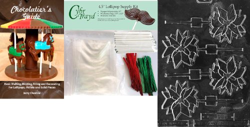 Cybrtrayd Poinsettia Lolly Chocolate Mold with Chocolatier's Bundle of 50 Lollipop Sticks, 50 Cello Bags, 25 Red and 25 Green Twist Ties and Chocolatier's Guide