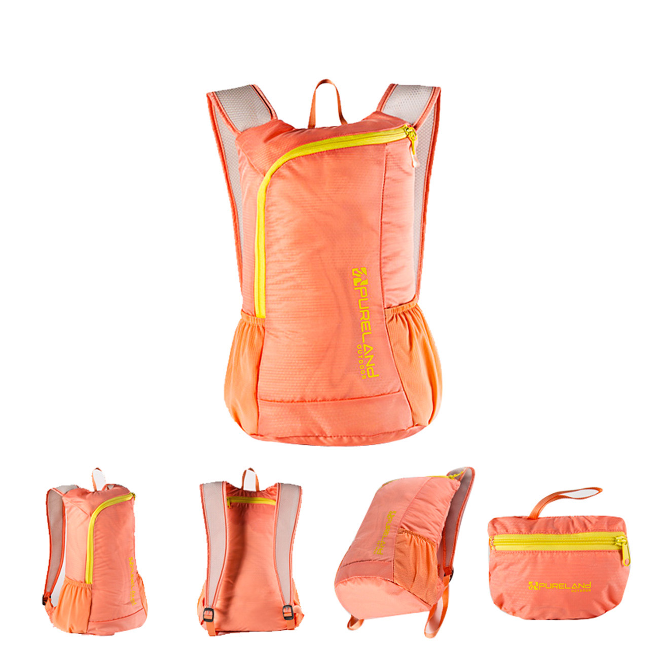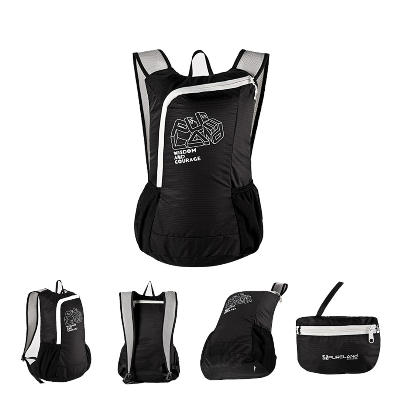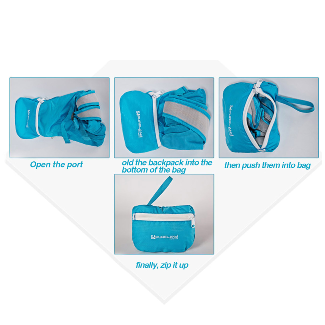 Open the port fold the backpack into the bottom the bag then push them into bag of finally zip it up.
