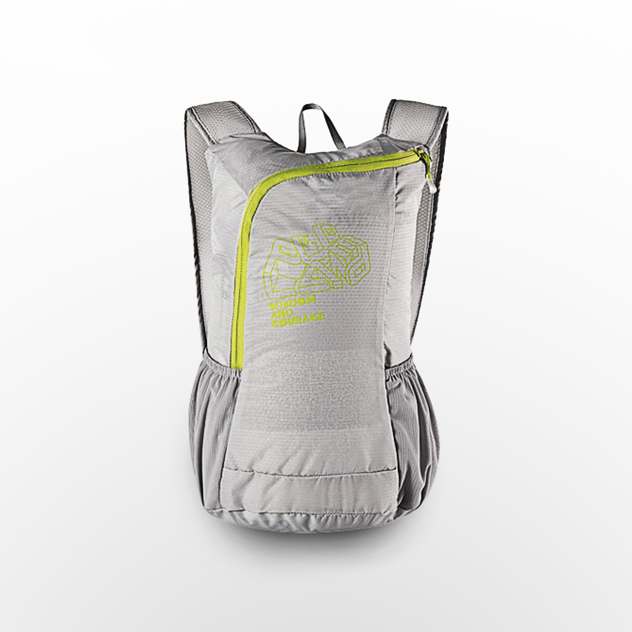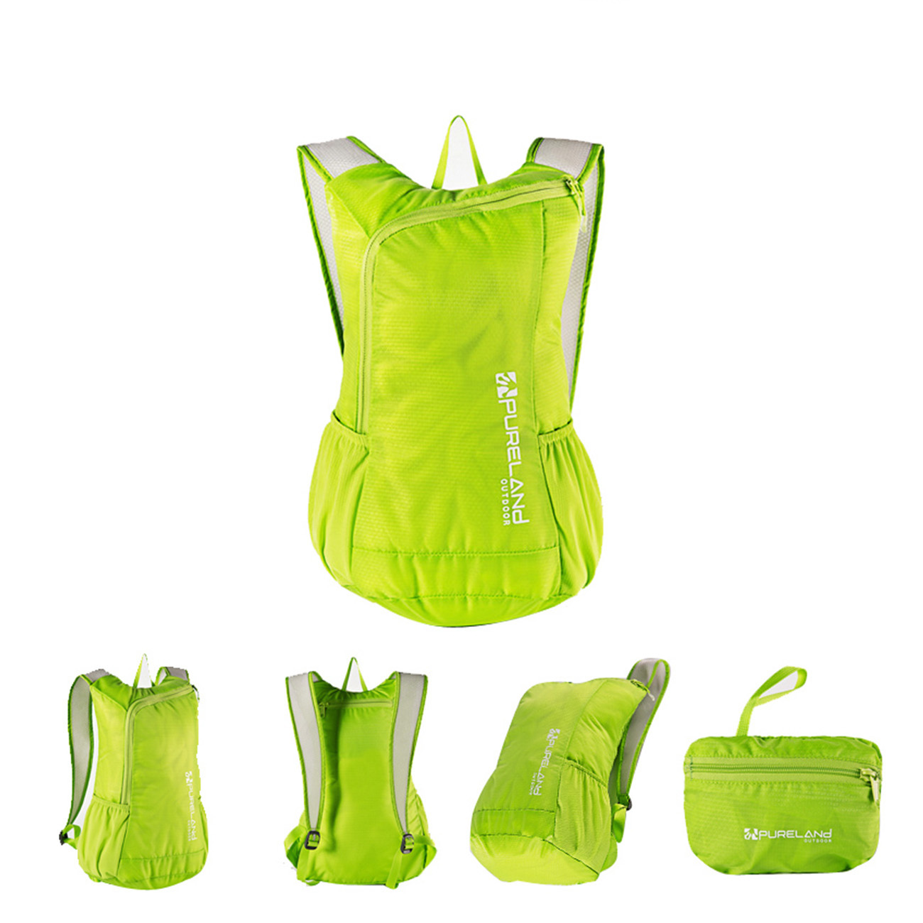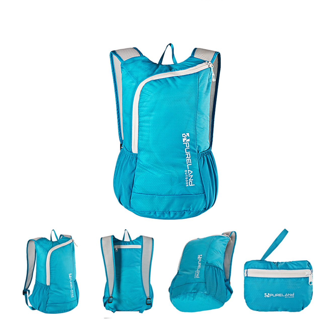 Open the port fold the backpack into the bottom the bag then push them into bag of finally zip it up.