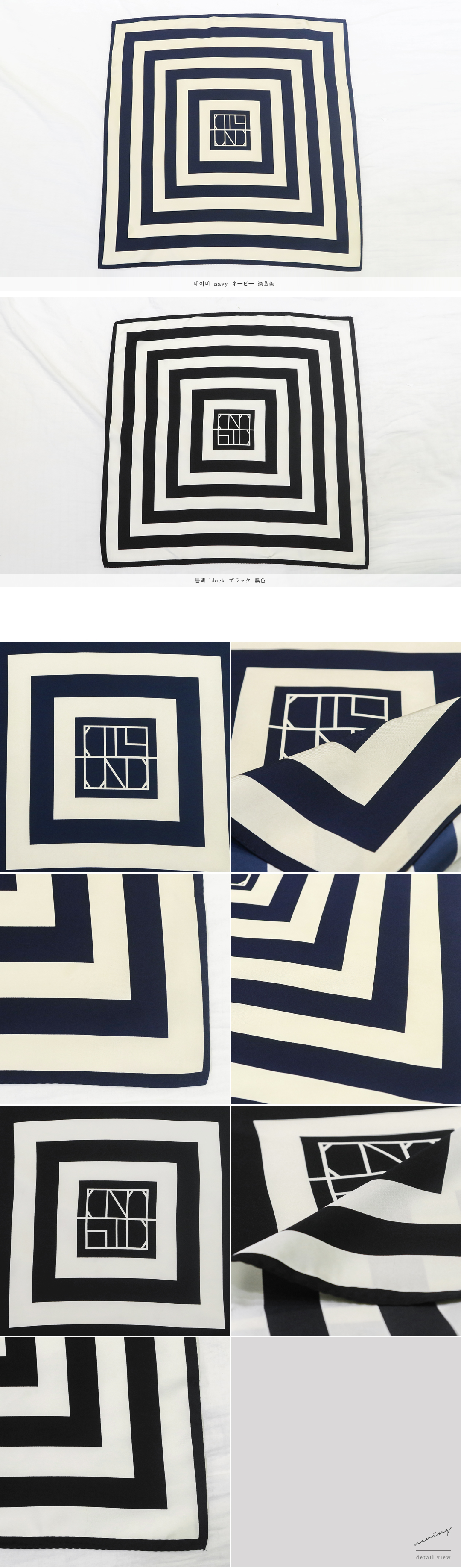 유니크한 패턴으로 시선을 사로잡는 스카프 소개해드릴께요.실크원단으로 매끈하고 부드러워 바디에 닿는 촉감이 너무 좋구요.고급스럽고 유니크한 패턴으로 묶어서 연출시 더욱 예쁘답니다.무난한 기본 컬러감으로 다양한 룩에 스타일링이 가능해요.하나쯤 소장하시면 밋밋한 룩에 포인트 주기 좋답니다.