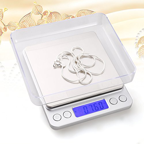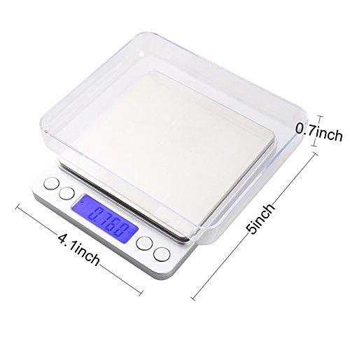- Accurate & Wide Range: Food scale built with high precision sensor system, provides you with instant and accurate results from 0.01g (0.001oz) to 500g. Easy to clean and use, make it an ideal to measure jewelry, medicine, and cooking ingredients with refined accuracy.(Platform: 3.94 X 3.94 inch, Product dimension: 5X 4.1 X 0.7 inch)