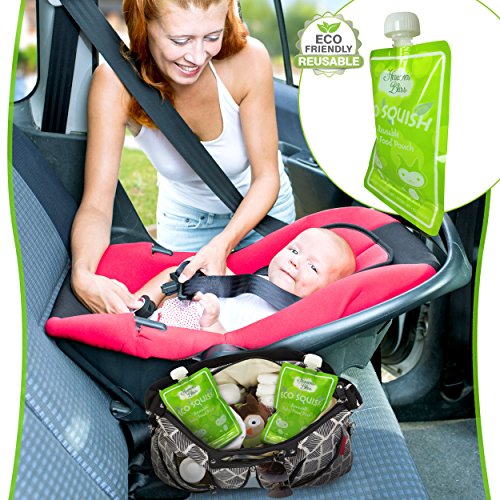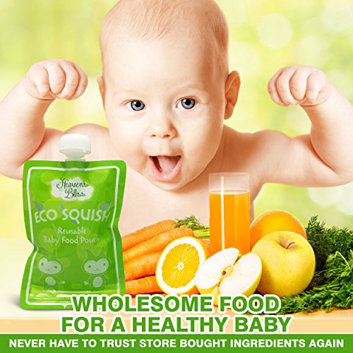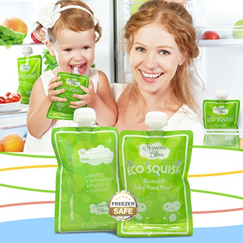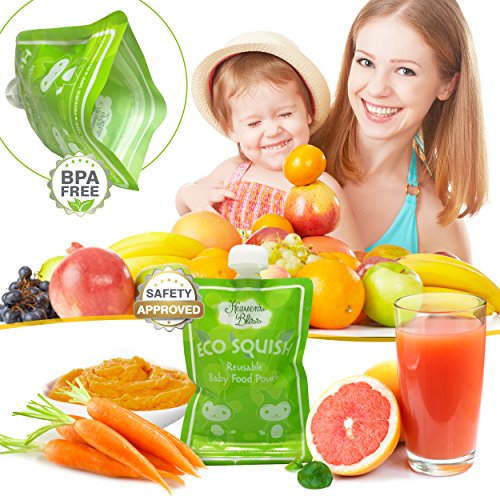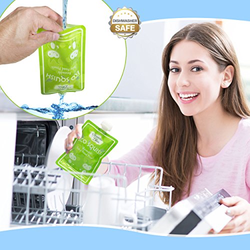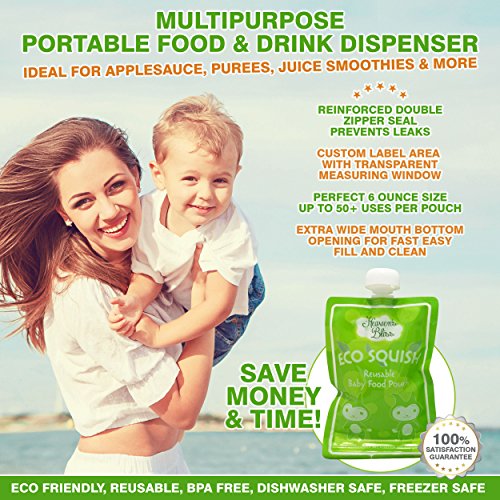 - Feature : Ultimate time saver in 3 simple steps, just fill, feed and wash; no awkward side spout; top spout allows for more natural feeding and faster cleaning; easily rinses bottom to top with fast air dry; hassle free, no mess or spoon feeding; extra durable reinforced double zipper seal prevents leaks; freezer and dishwasher safe for easy storage / Instantly save money; cost efficient reusable pack of 8 easy squeeze pouches; superior quality, 50 plus uses per pouch; eco friendly, refillable with no plastic waste; easily store in diaper bag, freezer, refrigerator and more; ideal use at home, or for on the go feeding in the car, airplane, outdoors and more; the ultimate no mess food and beverage dispenser for infants, toddlers and kids of all ages; now smart moms can have an easier life / Elite durable design with built in transparent measurement window and custom label area for moms; perfect size holds up to 6 ounces; extra wide bottom opening allows for easy filling and fast cleaning; now you can feed your child the best wholesome foods and feel guilt free / Never have to trust store bought ingredients again; no more preservatives or added sugar; perfect for serving fresh juices and smoothies too; portable food and drink dispensers are ideal for lunch boxes, babysitters or grandparents house; free healthy recipes ebook with purchase; the best healthy smart choice for concerned moms / BPA, PVC, lead and phthalate free reusable pouches; dishwasher and freezer safe; environmentally friendly food pouches for instant easy storage; now you can feed your child wholesome goodness filled with love; simple and rewarding