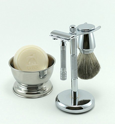 Shaving Gift Set with Merkur Short Handle Safety Razor, Chrome Bowl, GBS Shaving Soap, Chrome Badger Brush, Stand Brush and Razor