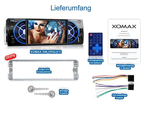 -. Title : XOMAX XM-VRSU411 Autoradio / Moniceiver + 7 Farben einstellbar (blau, türkis, weiß, grün, gelb, lila, rot) + 10 cm / 4" Zoll Farb-Monitor/Display/Bildschirm + USB Anschluss & Micro SD / SDHC Slot (jeweils bis zu 32 GB!) für MP3, WMA, AVI, MP4 + AUX IN Anschluss + ohne CD Laufwerk + Anschluss für Rückfahrkamera + Video out + Single DIN (1 DIN) Standard Einbaugröße + inkl. Einbaurahmen & Fernbedienung