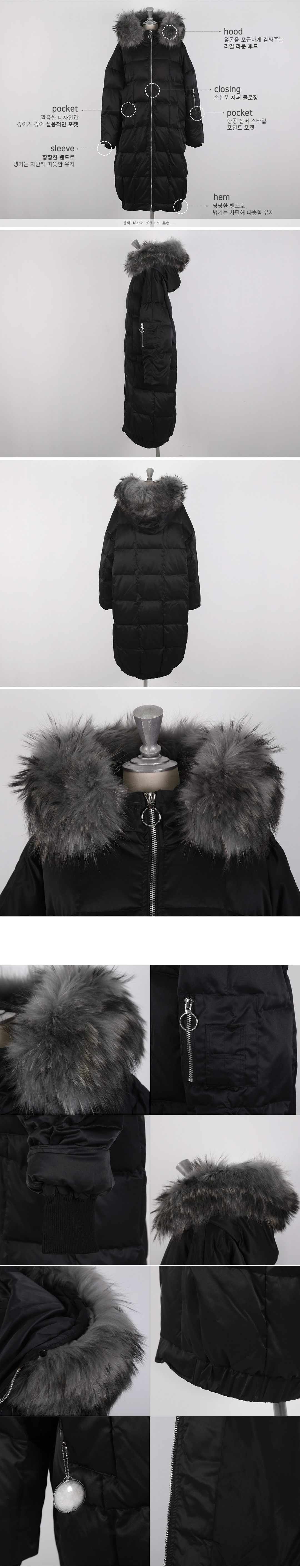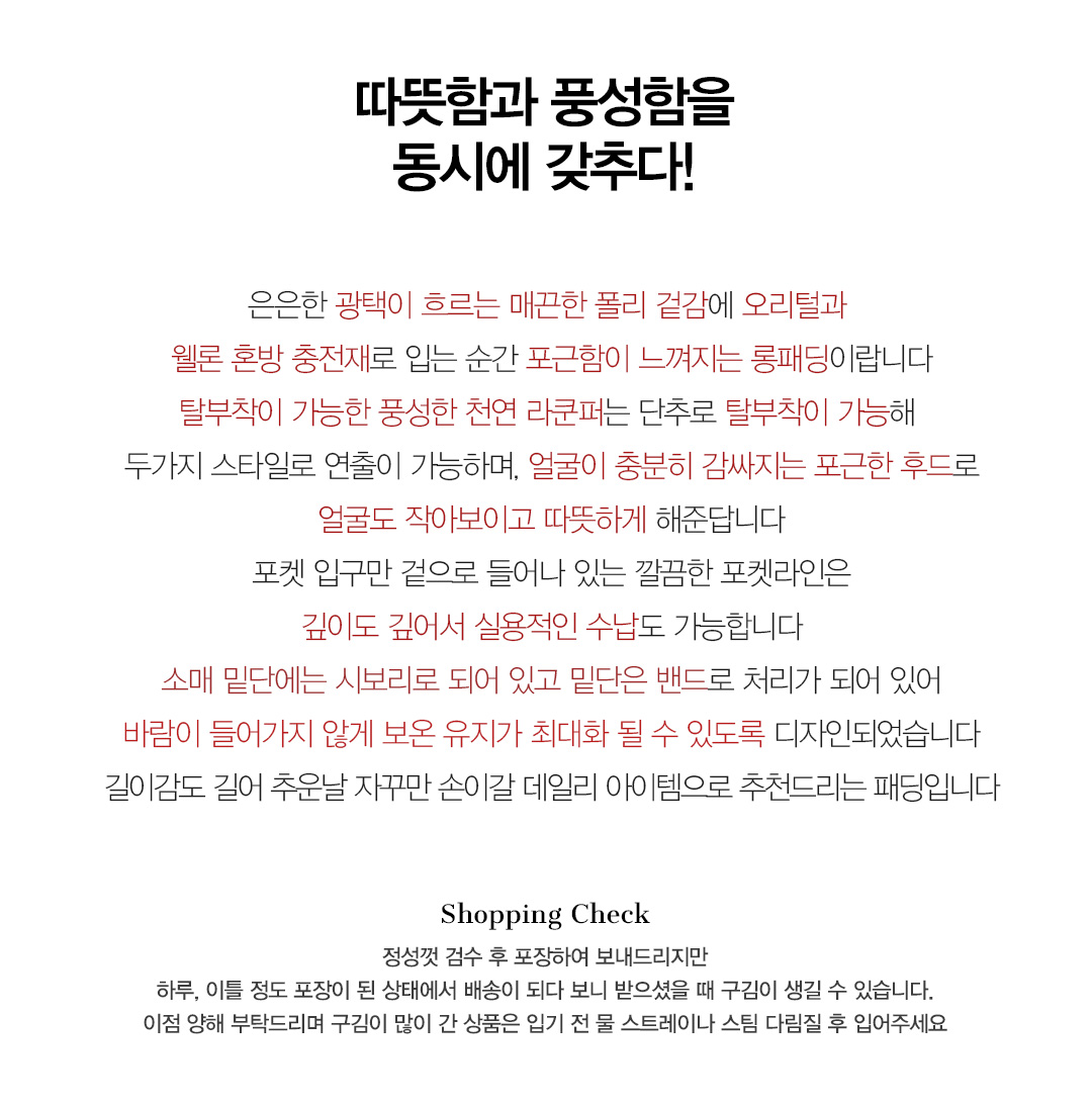폴리에스테르(polyester/)100%/충전재(Filler/)오리솜털(duckdownyhair/)50%+웰론(wellon/)50%/모자털(hoodfur)리얼라쿤(realraccoon/)100%