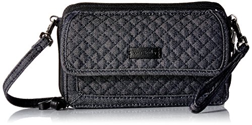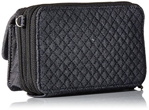 Our quilted denim is a cotton/poly blend. Provides rfid protection for credit and debit cards. Exterior features a phone slip pocket. Interior features eight card slips, six slip pockets, one bill pocket, one zip pocket and one id window. Zip and magnetic closures.
