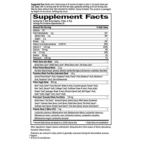 SUPERFOOD SUPPLEMENT: This greens powder is packed with 17 organic vegetable juices, 12 fermented sprouted grains, seeds, and legumes, 8 marine plants, and 7 whole fruits and berries