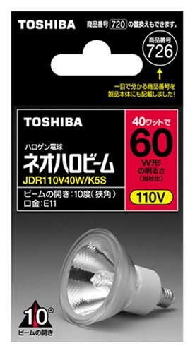 ● Manufacturer name: Toshiba ● Model number: R110V40W / K5S ● Product name: Halogen bulb Neo Halo Beam 60 W type narrow angle base E11 390 lm ● JAN code: 4974550331227 ● Halogen bulb using high performance dichroic mirror with 50 mm outer diameter.