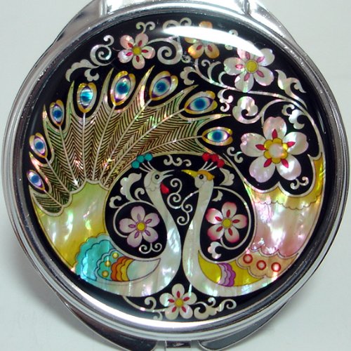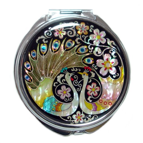 Mother of Pearl Peacock Pair and Flower Design Double Compact Magnifying Purse Mirror, 3.2 Ounce