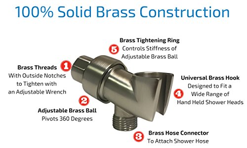 100% METAL Hand Held Shower Head Holder Bracket Universal Shower Arm Wall Mount Hook with Adjustable Brass Pivot Ball, Brushed Nickel