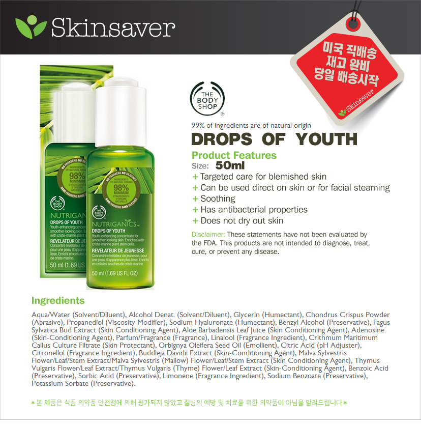 제조국 : 영국, 주요성분: 아쿠아 / 물 (용매 / 희석제), 알코올 Denat. (용매 / 희석제), 글리세린 (보습제), Chondrus Crispus 분말 (연마), 프로판 디올 (점도 수정), 소듐 하이 알루로 네이트 (보습제), 벤질 알코올 (방부제), 너도밤 sylvatica입니다 새싹 추출물 (피부 컨디셔닝 제로), 알로에 베라 잎 주스 (피부 컨디셔닝 제로), 아데노신 (피부 컨디셔닝 제로), 퍼퓸 / 향수 (향수), 리 날롤 (향기 성분), Crithmum Maritimum 캘러스 배양 여과 액 (피부 보호제), Orbignya 올레이 페라 씨 오일 (연화), 구연산 (pH 조절제 ), 시트 로네 (향기 성분은), Buddleja Davidii는, 매크로 malva sylvestris의 꽃 / 잎이 / 추출 / 매크로 malva sylvestris의이 (아욱) 꽃 / 잎이 / 추출물 (피부 컨디셔닝 제로)를 줄기, 흉선 심상 꽃 / 잎 추출물 줄기) (피부 컨디셔닝 제로의 압축을 풉니 다 / 흉선 심상 (백리향) 꽃 / 잎 추출물 (피부 컨디셔닝 제로), 안식향산 (방부제), 소르빈산 (방부제), 리모넨 (향기 성분), 벤조산 나트륨 (방부제), 칼륨 소르 베이트