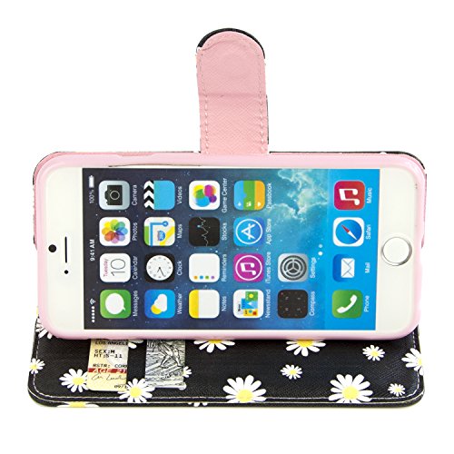 iPhone 6 Case, Dimaka Floral Pattern Daisy Flower Wallet Case, with Flip Stand Card Slots Cash Compartment, Premium PU Leather with Strap Hole for iPhone 6 / iPhone 6S - Black Daisy