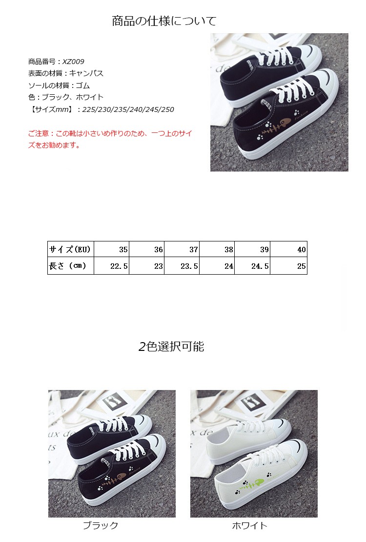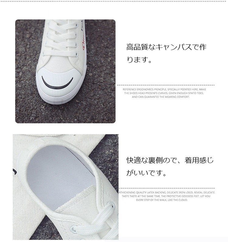商品番号:XZ009材質:キャンパス+ゴム色:ホワイト、ブラックヒールの高さ:2cm約 アッパーの高さ:5cm約サイズについてEU35=22.5cm EU36=23cm EU37=23.5cm EU38=24cm EU39=24.5cm EU40=25cm注意:※ サイズなど、商品詳細を必ずご確認後、ご了承頂いた上でご購入をお願いします。また、採寸方法違いにより、0.5~1cmの誤差がございますので、ご了承ください。商品内容:1xスニーカー特徴:【軽量、通気性よい】ゴムのソールとキャンパスの材質でスポーツシューズならではの軽さを実現し、通気性もよいです。どんな季節でも着用します。 軽量なので、ランニングや歩くや他の運動が易くになりました。【可愛いデザイン】黒白な配色で、シューズがファッションになり、女性に最適です。可愛いデザインなロゴが付きので、学生に通学靴としてもよい選択です。 【ゴムのソール耐滑】柔らかい材質で作って、ゴムのソールので、耐滑のです。スムーズな足運びをサポートします。球技や他の運動にもスムーズになりました。【利用場合】スポーツだけでなく、通勤や通学やアウトドア、普段履きとしても カジュアルなコーディネートをお楽しみい ただけます。