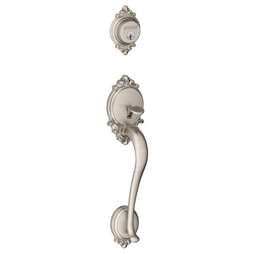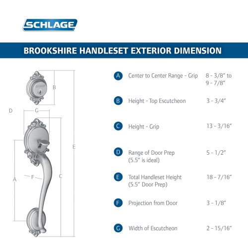 -. Binding : Tools & Home Improvement -. Brand : Schlage Lock Company -. Feature : Exterior half only / Requires F59 to complete handle set / Patented adjustable bottom through-bolt for easy installation. Moves up and down 1-1/2-Inch to fit pre-existing holes / 4-Inch minimum center to center door prep required for this two piece model / Lifetime Mechanical and Finish Warranty -. Label : Schlage -. Manufacturer : Schlage -. Model : F58 BRK 505-PARENT -. NumberOfItems : 1 -. PackageQuantity : 1 -. ProductGroup : Home Improvement -. ProductTypeName : HARDWARE -. Publisher : Schlage -. Studio : Schlage -. Title : Schlage Brookshire Exterior Handleset with Deadbolt -. Warranty : Lifetime mechanical and finish