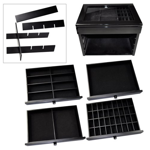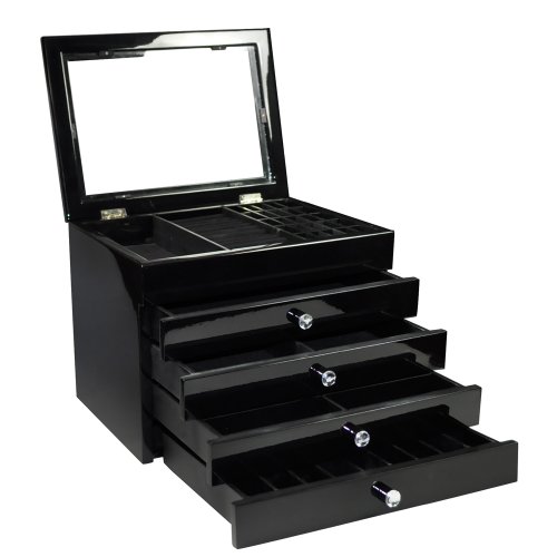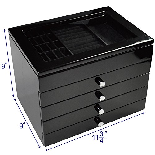 -. Feature : Has multiple drawers allowing maximum storing capabilities. / You can store jewelry, accessories, cosmetics, and many more. / The transparent top allows you to see and display your jewelry/accessories easier. / Can be used for trade shows, show casing, casual at home uses, and many more. / Black glossy wood is pleasing to the eyes 11 3/4"W x 9"Dx 9"H.