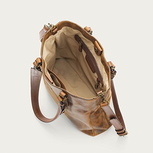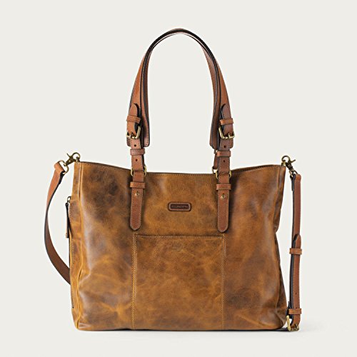 Product Description Turn heads with the vintage inspired style of the Aubrey Leather Tote bag. It is crafted in a warm whiskey hue of distressed Glazed Leather and antique brass hardware, complementing the character of the bag. The rich brown leather of the two equestrial style top handles and detachable crossbody strap will age beautifully as you wear it. The main compartment is spacious yet slim, and will fit a 13" laptop with ease. Your everyday essentials will remain organized with several interior compartments and 2 magnetized outside pockets. Available in "Whiskey" color. 0