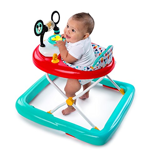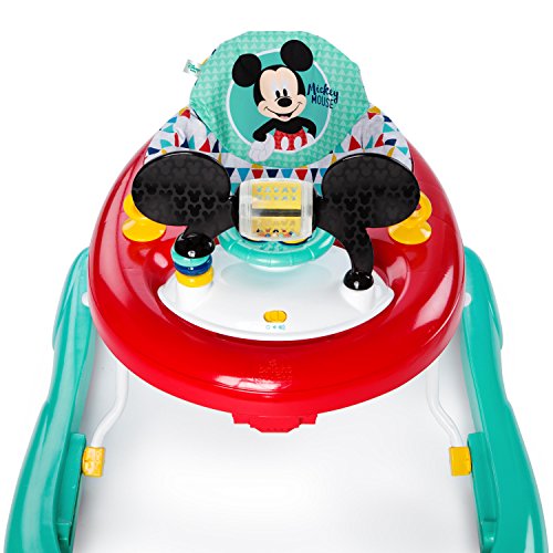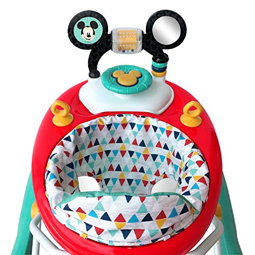 ReleaseDate : 2017-10-27 Studio : Kids II - (Carson, CA) Publisher : Kids II - (Carson, CA) Binding : Baby Product Product Description "Oh boy." Mickey Mouse brings the fun with Disney Baby's Mickey Mouse Happy Triangles Walker from Bright Starts featuring removable toy station, lights, and sounds. Encourage baby to explore on their feet in the walker while engaging with the electronic toy station. Baby will find plenty of Mickey Mouse-themed activities on the removable toy station that's great for floor play and on-the-go. This fully-loaded walker entertains with a bead chaser, spinning roller ball filled with colorful beads, a steering wheel that activates lights, music, and sounds, a mirror, plus two loops to add more of baby's favorite toys. When the toy station is removed, the built-in tray lets baby play with other toys. A high seat back provides comfort and support for baby. The design of this baby walker allows for easy fold, storage and portability. It is safety enhanced with rubber feet that "brake" and a sturdy frame. Make the fun last even longer by adjusting the walker frame to three different height positions to keep little toes at the perfect height. The walker can be easily kept clean by wiping it down where needed and tossing the seat cushion into the washing machine. 0
