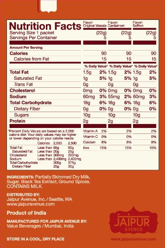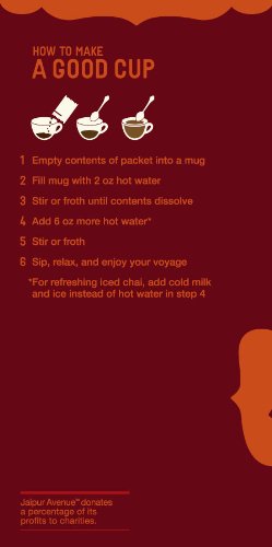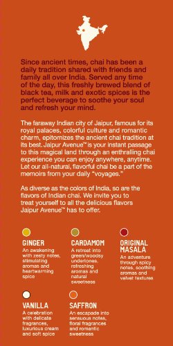 Since ancient times, chai has been a daily tradition shared with friends and family all over India. Served any time of the day, this freshly brewed blend of black tea, milk, and exotic spices is the perfect beverage to soothe your soul and refresh your mind. The faraway Indian city of Jaipur, famous for its royal palaces, colorful culture and romantic charm, epitomizes the ancient chai tradition at its best. Jaipur Avenue is your instant passage to this magical land through an enthralling chai experience you can enjoy anywhere, anytime. Jaipur Avenue Chai Tea Mix consists of premium black tea, dry milk powder, a delicate blend of exotic spices, and minimal amount of sugar. Just add hot water for a cup of heartwarming chai, or chilled milk and ice for a cool, refreshing summer drink.Feature