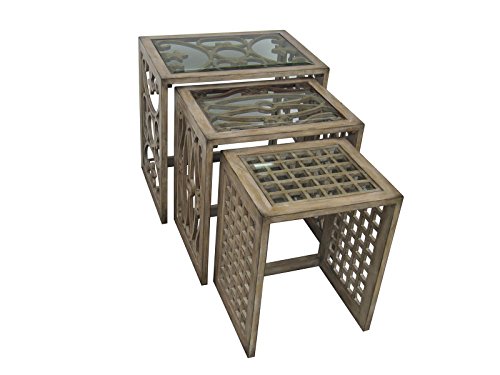 -. Binding : Kitchen -. Brand : Pulaski -. Color : medium wood -. Department : Accent Tables -. EAN : 0715709378694 -. Feature : Alternating fretwork patterns in a natural brown finish provide an ornamental alternative to traditional nesting tables / The tops have beveled glass inserts and these tables can be used individually or together / Made in China -. Label : Home Meridian International -. Manufacturer : Home Meridian International -. Model : 675103 -. MPN : 675103 -. NumberOfItems : 1 -. PackageQuantity : 1 -. PartNumber : 675103 -. ProductGroup : Furniture -. ProductTypeName : HOME_FURNITURE_AND_DECOR -. Publisher : Home Meridian International -. Size : 29.75 in. W x 29.75 in. D x 22 in. H -. Studio : Home Meridian International -. Title : Pulaski Vivienne Nesting Tables, 29.75 by 29.75 by 22-Inch, Natural -. UPC : 715709378694