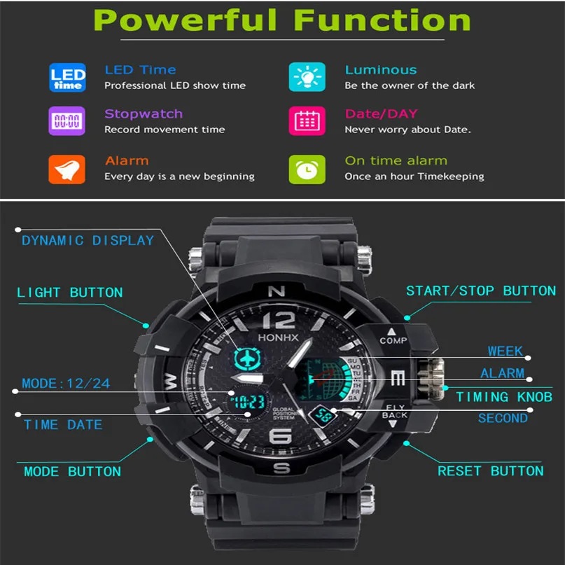 Feature:Week Display,Water Resistant,Stop Watch,Back Light,LED display,Safety Warning