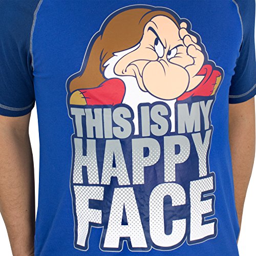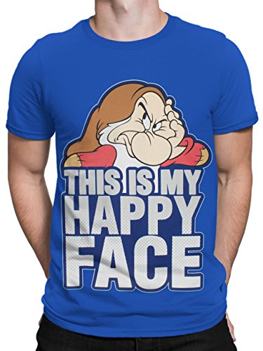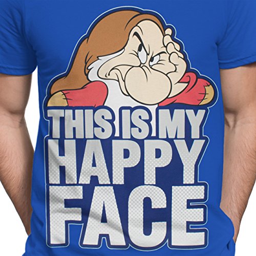 Binding : Apparel Product Description Mens Grumpy T-shirt. Get some iconic style inspired by the classic film, Snow White and make a grumpy smile with this cool Disney Grumpy T Shirt. It comes with a cool design of the character plus the slogan 'This is my happy face' in bold colours. This blue Grumpy top is an ideal addition to anyone's wardrobe and can be easily worn in all weathers. The rounded neck and short sleeves on this awesome Mens Disney Snow White Tshirt make it a comfy option to wear all year round! 0