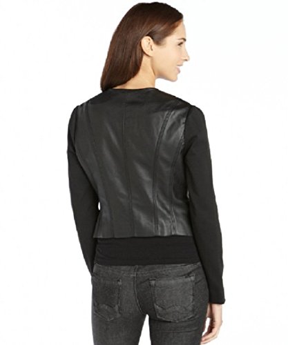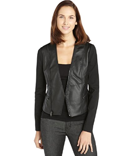 DETAILS BCBGMAXAZRIA Lightweight Faux Leather Collarless; Asymmetrical Zip Front Closure Angled Zip Pockets At The Waist Long Stretch Knit Sleeve Contemporary Fit Fully Lined Machine Wash Or Dry Clean Shell: 100% Polyurethane / Back: 100% Rayon / Contrast: 72% Polyester / 24% Rayon / 4% Spandex; Lining: 67% Cotton / 30% Nylon / 3% Spandex