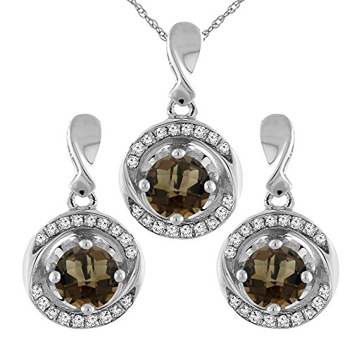 -. Title : 14K White Gold Natural Smoky Topaz Earrings and Pendant Set with Diamond Accents Round 4 mm