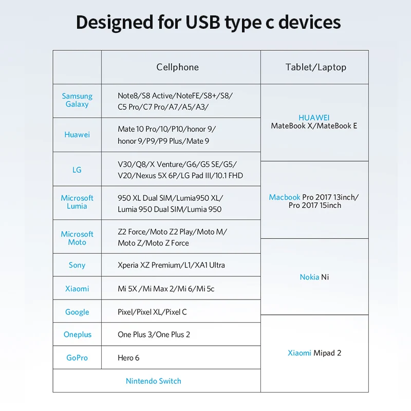 USB c devices:For Macbook samsung galaxy s8 s7 Huawei p10 p9 p20.......