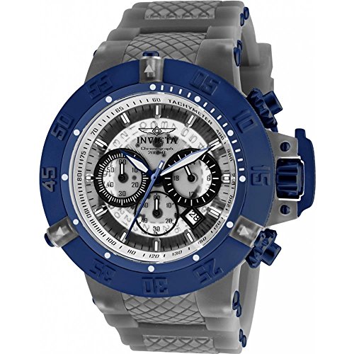 Invicta 24371 Subaqua Noma III chronograph men's dive watch features a 50mm wide and 18mm thick grey transparent plastic case with a unidirectional rotating blue ion plated solid stainless steel bezel and textured push-pull crown with function pushers. Invicta 24371 is powered by Japanese SII VD53 quartz chronograph movement. This stylish watch also features a textured transparent white dial with white accents blue luminous hands and index hour markers along with the chronograph, 12/24-hour time and date display functions, scratch resistant mineral crystal and water resistant to 200 meters. Invicta 24371 is equipped with a 28mm wide grey transparent silicone rubber and transparent plastic strap with a buckle clasp. Invicta 24371 men's Subaqua Noma III blue bezel chrono silicone & plastic strap dive watch is brand new and comes in an original Invicta gift box and is backed by a 5 year limited warranty.Feature
