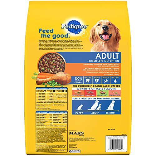 PEDIGREE Adult Complete Nutrition Roasted Chicken, Rice & Vegetable Flavor Dry Dog Food is formulated to give dogs all of the energy and nourishment they need to continue living life to the fullest. This chicken-flavor dog food is packed with B vitamins, zinc and omega-6 fatty acid to help keep adult dogs looking their best. Now with no high fructose corn syrup, no artificial flavors, and no added sugar. PEDIGREE Dry Dog Food also contains leading levels of the antioxidant, vitamin E, to help keep adult dogs' immune systems strong. Plus, this balanced dog food features our special fiber blend, which helps promote healthy digestion, to keep yard patrol in control. Feed your dog this oral care kibble to help keep teeth clean and give them a great taste.Feature