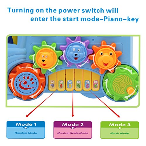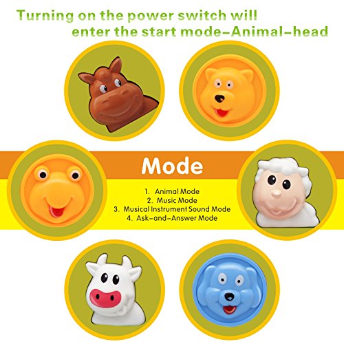 MULTIPLE FUNCTIONS MUSIC MODE: 3 play modes for Six piano buttons: Number Mode-from one to six;Musical Scale Mode-you can play the songs you like;Music Mode-six songs;4 play modes for Animal-head buttons:Animal Mode-6 kinds animals sounds;Music Mode-play beatiful music;Musical Instrument Sound Mode-play dynamic beating sound of musical instrument;Ask&Answer Mode-if you can answer three questions ,it will play music