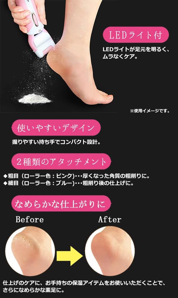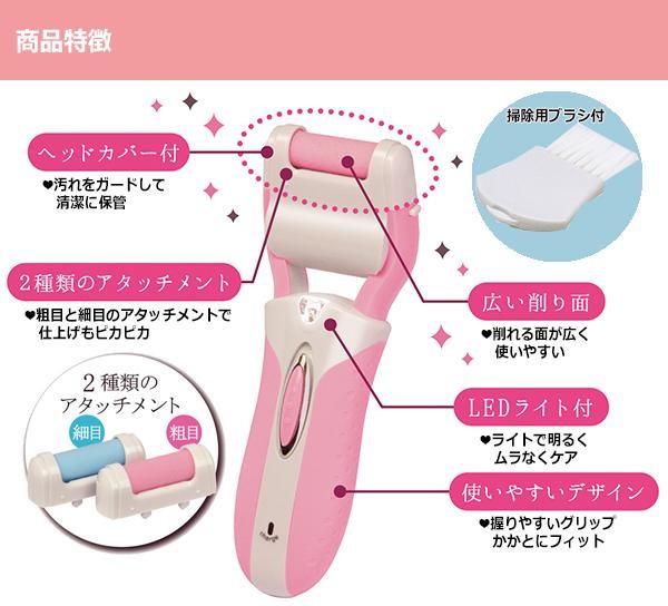 ひび割れ、カサカサ、こなふきなど、なでるだけで簡単にケアできる角質リムーバーです。パワー長持ちの充電式なので、粘り強い「回転力」と、安定したパワーを最後まで供給する「持続力」で、繰り返し使えて経済的です。カチコチ角質もしっかりケア★また本体にはヘッドカバー、付属品としてお掃除ブラシが付いているので、お手入れをする事で、いつでも清潔にご使用いただけます。 |