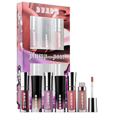 The Plump Your Pout Six Piece Mini Lip-Plumping Collection lets lips stand out with shades that range from pale pinks to provocative plums. This mini, pout-plumping collection features shimmering polishes, glassy-smooth creams, and lightweight liquid lipsticks that can be worn alone, or layered together for your own custom look.