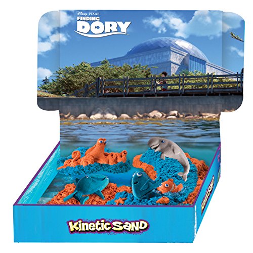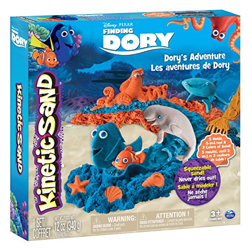 Kinetic Sand is the squeezable sand you can’t put down! It sticks to itself and not to you! It flows through your fingers like magic, leaving them completely dry. Kinetic Sand stimulates children’s creative skills, allowing them to create anything they can imagine over and over again. The Kinetic Sand Finding Dory set comes with 3 colors of sand, an underwater ocean play space, and a multi tool for sculpting — the creative possibilities are endless! Plus with Dory, Nemo, Hank, Destiny, and Bailey molds you can create all your favorite characters from the movie. Kinetic Sand never dries out, and this soft sand is easy to clean up. Feel the fun with Kinetic Sand!Feature