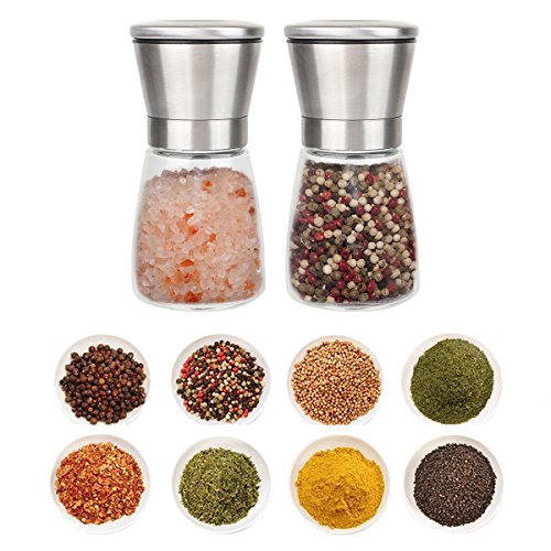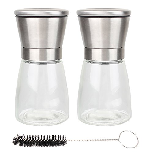 Hihamer Set of 2 Glass and 304 Stainless Steel Salt and Pepper Mill Grinder Shaker Set with Nylon Cleaning Brush