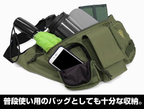 자크의 웨스트를 이미지 한 웨스트 백!전측의 3개의 블럭은,모두 포켓이 되어 있으므로 쓰기에 편리 함 발군!좌우의 포켓에는,카라비너 등을 붙여지는 편리한 벨트 부착.웨스트 백으로서는 물론 숄더백으로서의 사용도!모티브 부분은 자수에 재현.평상시 사용용의 백으로서도 충분한 수납력의 개성적인 백입니다.《고스파》의 지온이나 자크를 모티브로 한 어패럴과의 궁합도 발군입니다.
