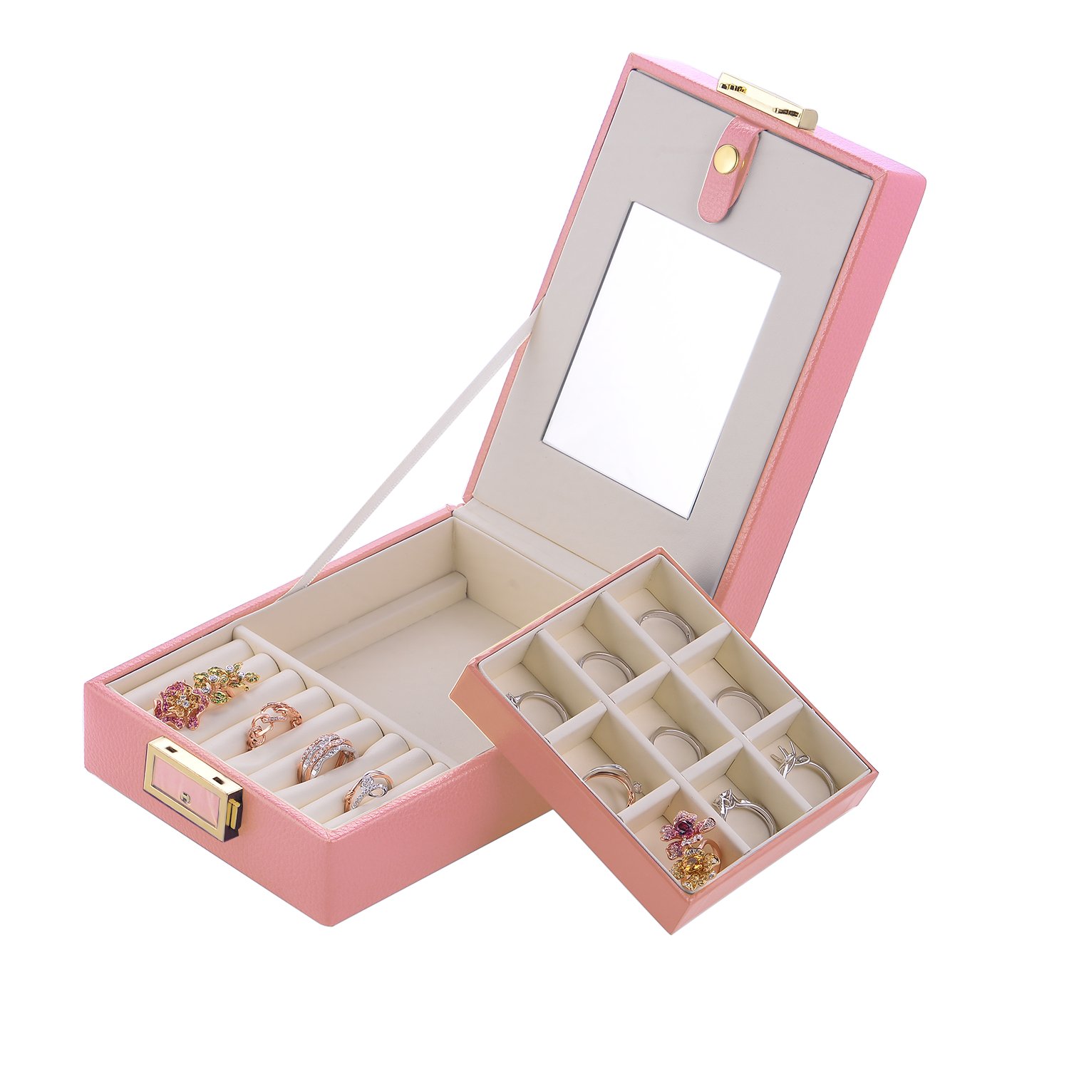 ジュエリーボックスのサイズ:6cm (H) X 12cm (W) X 17cm (L) 多層構造のダブルスリットデザインで、さまざまなジュエリーを収納可能 指輪、ペンダント、チェーン、イヤリング等が入ります。中に鏡があり外側から鍵がかかります。 二段式でたくさんジェエリーが入ります! 3×3、合計9つの仕切りでイヤリングや指輪等小さなジェエリーの保管にぴったりです。 ジェエリーを安全に区分けして持ち運べます。お気に入りのジェエリーが旅行先でも楽しめます!