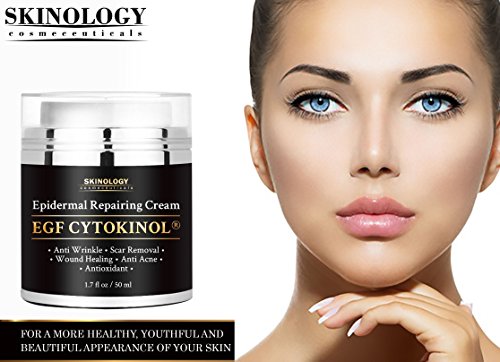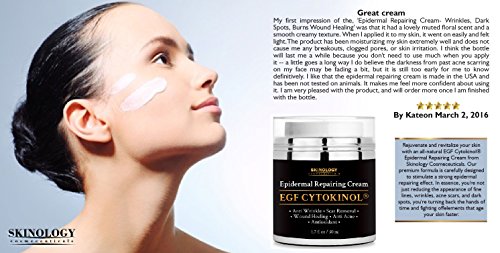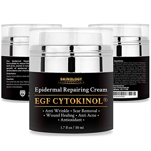 - Feature : PROUDLY MADE IN USA Our advanced Epidermal Repair Cream is developed and produced in the GMP Certified US facility, Absolutely Cruelty-Free and never tested on animals. It accelerates the healing and natural regrowth of skin cells and enhances collagen production. Combined, these effects vastly improve skin elasticity, while simultaneously reducing wrinkles, fine lines, dark spots and acne scars. / WORKS WITH ANY SKIN TYPE Skinology Cosmeceuticals has carefully designed a skincare treatment that not only heals the skin, it goes on light and smooth to moisturize and replenish the skin with essential nutrients and vitamins. Even better, it works with a wide variety of skin types, including dry, oily, sensitive, irritated or combination. / CLINICAL STRENGTH Packed with essential fatty acids, vital nutrients, and powerful antioxidants including Tocomin® and Olean Europaea Fruit Oil, our premier formula deeply penetrates the skin to fight damage at the source-your cells. You won't find a more potent skin repair solution than EGF CYTOKINOL® Epidermal Repair Cream by Skinology Cosmeceuticals. / SUSTAINED SKIN PROTECTION Featuring two of the most effective skin protectants available today-Cytokinol® and Adaptonyl®-our epidermal repair cream protects your skin with anti-inflammatory and anti-bacterial ingredients even after it's worn off. This ensures your skin continually repairs itself while providing your skin with a natural barrier against external conditions, acne and even cutaneous homeostasis. / 100% SATISFACTION OR YOUR MONEY BACK Try our Revolutionary Advanced Epidermal Repair Cream, you'll love its wonderful effects! If for some reason you are not completely satisfied with Skinology Cosmeceuticals EGF Cytokinol® Epidermal Repairing Cream - contact us and receive a full refund - No questions asked!!!- You don't even need to return the product! Try It Risk Free!