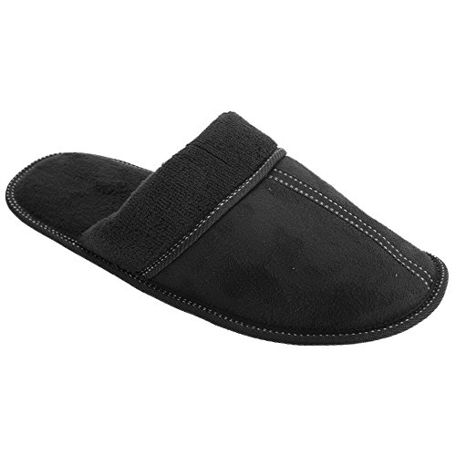 Binding : Apparel Product Description Mens mule slippers with memory foam sole. Memory foam inner for extra comfort. Open back. White stitch detail. Choice of 3 colours. Choice of 6 sizes. Upper: Textile. Lining and Insole: Textile. Sole: Textile. Wipe clean only. 0