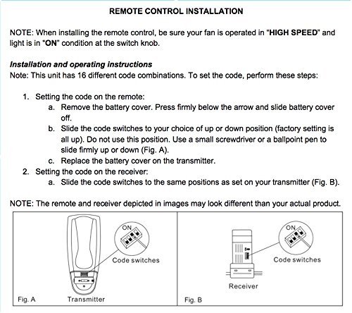 Has 4-dip switches in battery compartment for programming with receivers. For CFL and regular light bulbs. 3-speed ceiling fan remote control with full range light dimmer