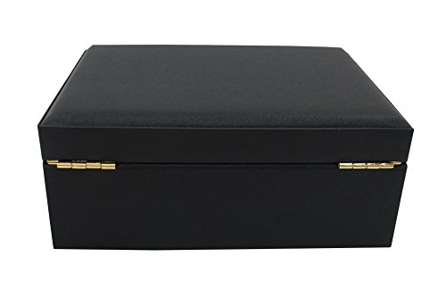 - Feature : Material: Black Saffiano Leatherette w/contrasting faux suede / Wooden construction;6 sectioned liftout tray; Gold Key lock / Dimensions: 26.7 x 18.4 x 10.2cm