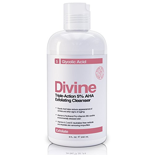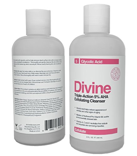 -. Brand : DIVINE DERRIERE -. EAN : 0806802641539 -. Feature : A great skincare routine begins with a great face wash to help your other beauty products work more effectively. Add Divine Triple-Action cleanse LARGE 8 OZ SIZE Glycolic Acid Exfoliating Cleanser to your routine and give your skin the freshness it deserves. The formula contains 5% GLYCOLIC ACID + PRO VITAMIN B5 + ALLANTOIN, which help to alleviate clogged pores and slough away dead skin, dirt and oil build up. / Instead of using a basic face wash that cleans only surface dirt, this cleanser uses potent ingredients for a DEEP CLEAN FEELING that can't be matched. Shea Butter + Aloe Oil + Retinol Palmytate + Vitamin A + Vitamin C + Vitamin E penetrate deep into your pores to get rid of excess grime while nourishing and smoothing your skin for a soft and supple look. / Our Medical grade facial cleanser uses robust ingredients to not only clean your skin but give your complexion LASTING BENEFITS. This gentle wash works to effectively reduce age spots, dark spots, sun spots and other forms of discoloration while helping with acne, acne scars and premature aging. / This facial cleanser is a great way to start or end your day to help BRIGHTEN A DULL-LOOKING COMPLEXION. For a complete skincare routine, pair it with a toner, serum and moisturizer to restore and rejuvenate your face and neck. / Divine offers a 90-day MANUFACTURER GUARANTEE on all its products. Just contact us to get a refund of your order and you get to keep the bottle. Our products are CRUELTY FREE and made right here in the USA in an FDA registered and GMP compliant facility. -. IsAdultProduct : 0 -. Label : Beautiste Brands -. Manufacturer : Beautiste Brands -. MPN : 806802641539 -. PackageQuantity : 1 -. PartNumber : 806802641539 -. ProductGroup : Health and Beauty -. ProductTypeName : PERSONAL_CARE_APPLIANCE -. Publisher : Beautiste Brands -. Studio : Beautiste Brands -. Title : Divine Triple-Action Glycolic Acid 5% AHA Exfoliating Creme Cleanser -. UPC : 806802641539