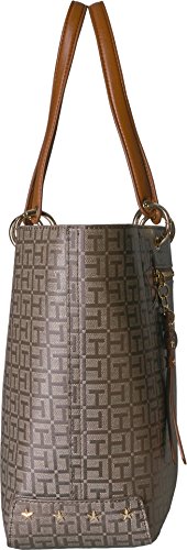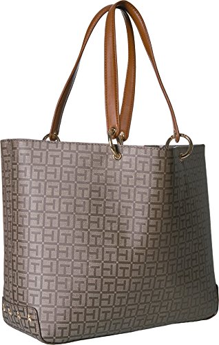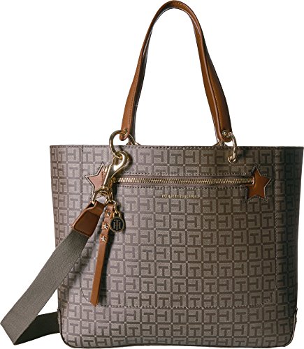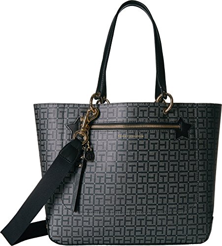 Travel tote bag for women featuring a coated woven th jacquard exterior, smooth to the touch. Printed interior pattern. This durable, water resistant bag fabrication will keep your tote bag free from stains. Exterior zipper with star studded zipper pull and th monogram charm. Flat bottom, double handles with convertible strap. Gold chain-link hardware details. Gold star studs at bottom side panels. This Tommy Hilfiger bag is a versatile essential, perfect for your next work tote. Our tote bag for women is a stylish addition to your collection of travel totes for weekend getaways. 18 length; 11-3/4 height; 5-1/2 width; 9-1/4/23-5/8 drop.