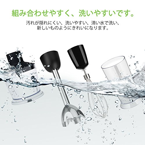 お鍋やボウルで直接に使えます。後片付けも簡単便利です。カップに中性洗剤とぬるま湯を入れ、少し運転させて汚れがなくなります。ハンドブレンダー本体、泡立て器接続部、ふた以外は食器洗い機で洗えます。金属製のヘッド部分は熱湯で消毒でき、衛生的で安心にご使用ください。優れた基本性能で料理も簡単、調理が快適かつスムーズにはかどります。