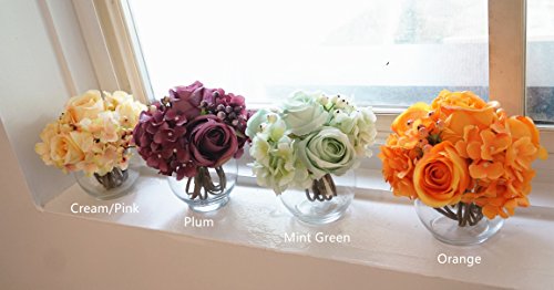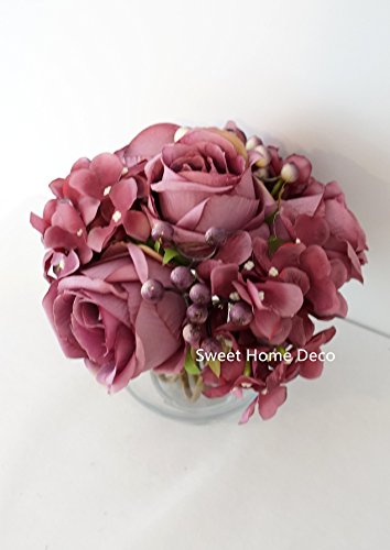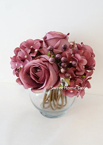Sweet Home Deco Silk Rose Hydrangea Berry Floral Arrangement in Glass Vase Table Flower Home Decor Wedding Centerpiece (Plum)