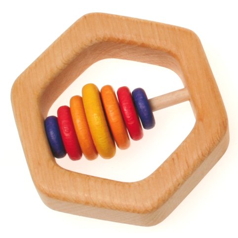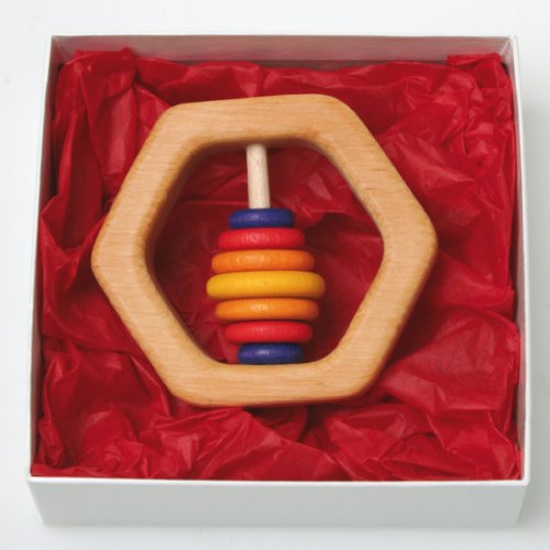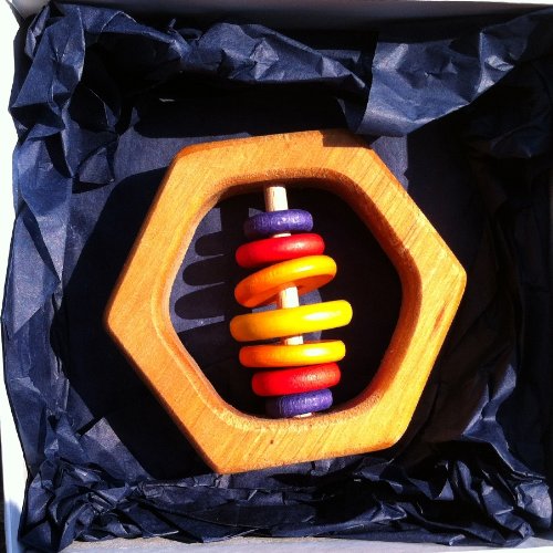 This hexagon-shaped rattle is handmade from natural hardwood and the rings are gently colored with child safe water based stains. Easy for baby to grasp, this rattle has 6 colorful discs which make a gentle noise when shaken.